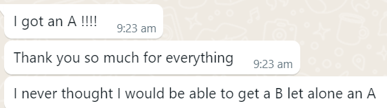 Thank you so much for helping me get that A I so desperately wanted!! I’m absolutely over the moon and still can’t believe I actually did it! Of course, I couldn’t have done it without you and I’m so grateful for all the help and support you gave me!